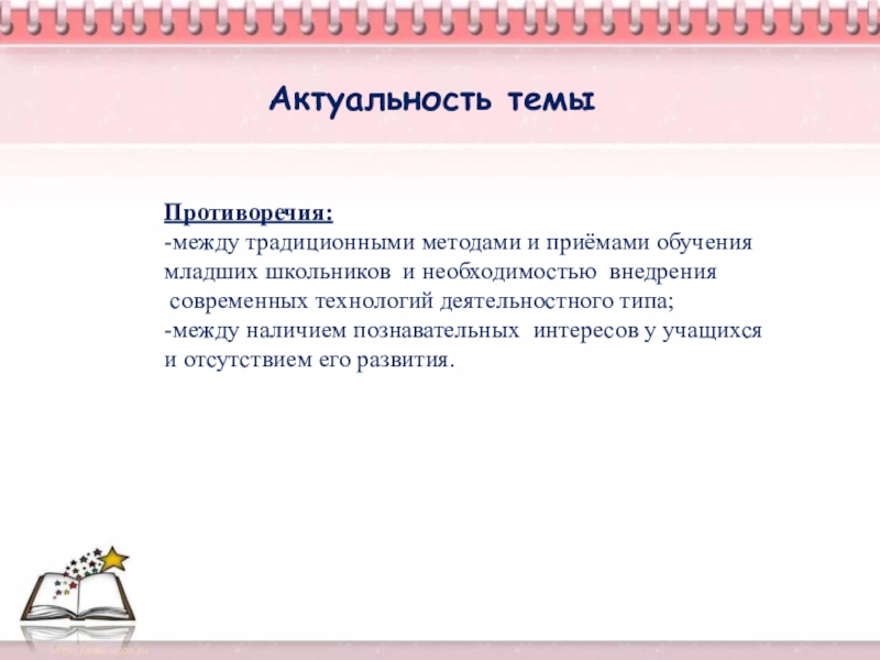учитель предваряет сообщение готовой темы либо интригующим материалом (прием «Яркое пятно»), либо характеристикой значимости темы для самих учащихся (прием «Актуальность»).