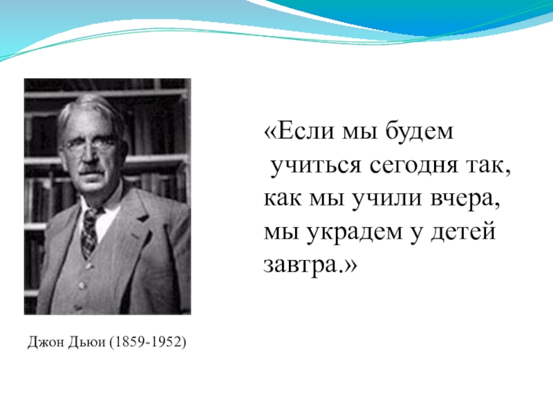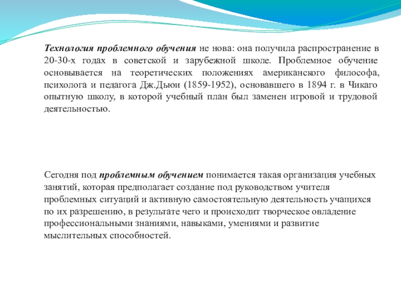 в советской и зарубежной школе. Проблемное обучение основывается на теоретических положениях американского философа, психолога и педагога Дж.Дьюи (1859-1952), основавшего в 1894 г. в Чикаго опытную школу, в которой учебный план был заменен игровой и трудовой деятельностью.