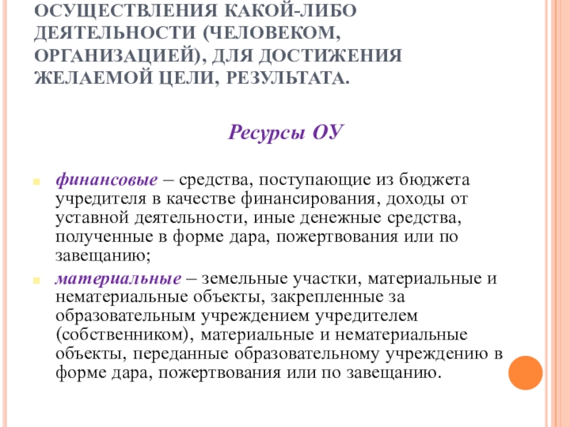 финансовые – средства, поступающие из бюджета учредителя в качестве финансирования, доходы от уставной деятельности, иные денежные средства, полученные в форме дара, пожертвования или по завещанию;