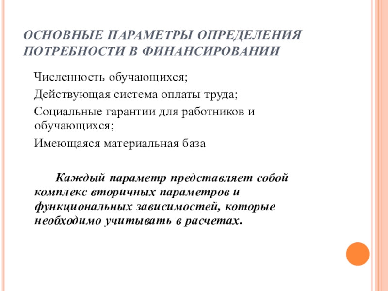 Слайд 68ОСНОВНЫЕ ПАРАМЕТРЫ ОПРЕДЕЛЕНИЯ ПОТРЕБНОСТИ В ФИНАНСИРОВАНИИ