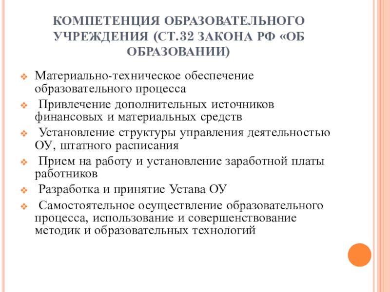Слайд 55КОМПЕТЕНЦИЯ ОБРАЗОВАТЕЛЬНОГО УЧРЕЖДЕНИЯ (СТ.32 ЗАКОНА РФ «ОБ ОБРАЗОВАНИИ)