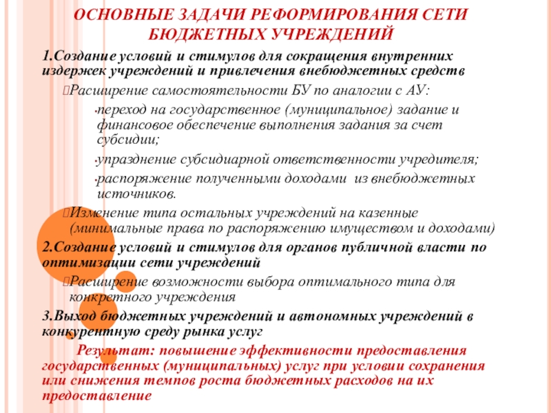 Слайд 12ОСНОВНЫЕ ЗАДАЧИ РЕФОРМИРОВАНИЯ СЕТИ БЮДЖЕТНЫХ УЧРЕЖДЕНИЙ