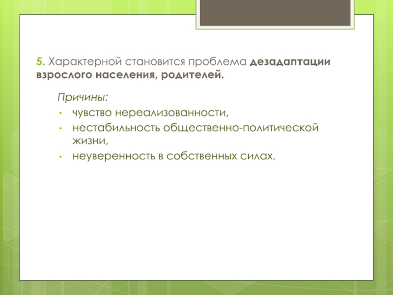 Современные дети имеют низкую способность к адаптации, что затрудняет освоение ими социального пространства адекватными способами. Как правило, неразрешенные трудности одного возраста влекут за собой появление других, что приводит к формированию целого симптомокомплекса, закрепляясь в личностных характеристиках.