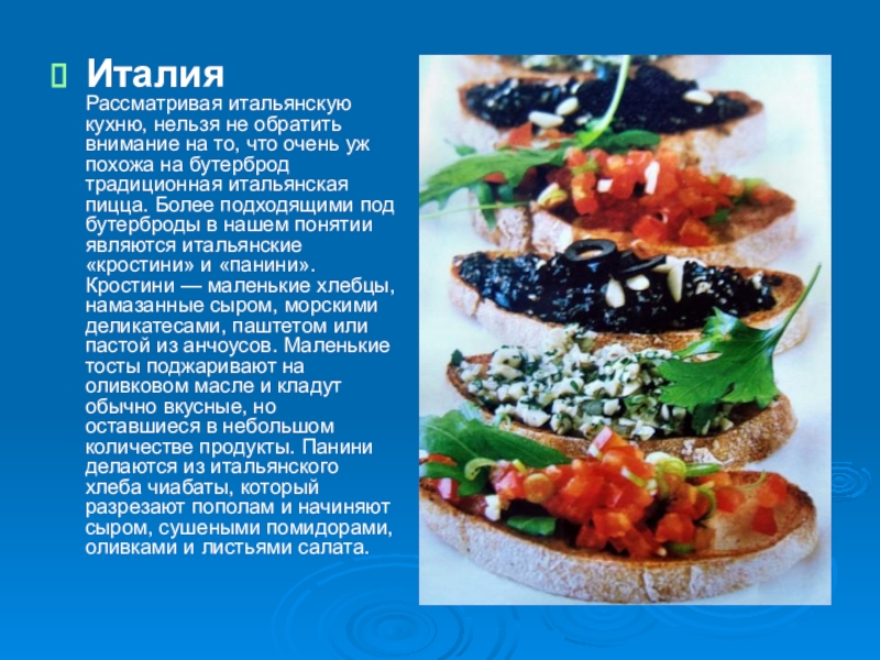 уж похожа на бутерброд традиционная итальянская пицца. Более подходящими под бутерброды в нашем понятии являются итальянские «кростини» и «панини». Кростини — маленькие хлебцы, намазанные сыром, морскими деликатесами, паштетом или пастой из анчоусов. Маленькие тосты поджаривают на оливковом масле и кладут обычно вкусные, но оставшиеся в небольшом количестве продукты. Панини делаются из итальянского хлеба чиабаты, который разрезают пополам и начиняют сыром, сушеными помидорами, оливками и листьями салата.