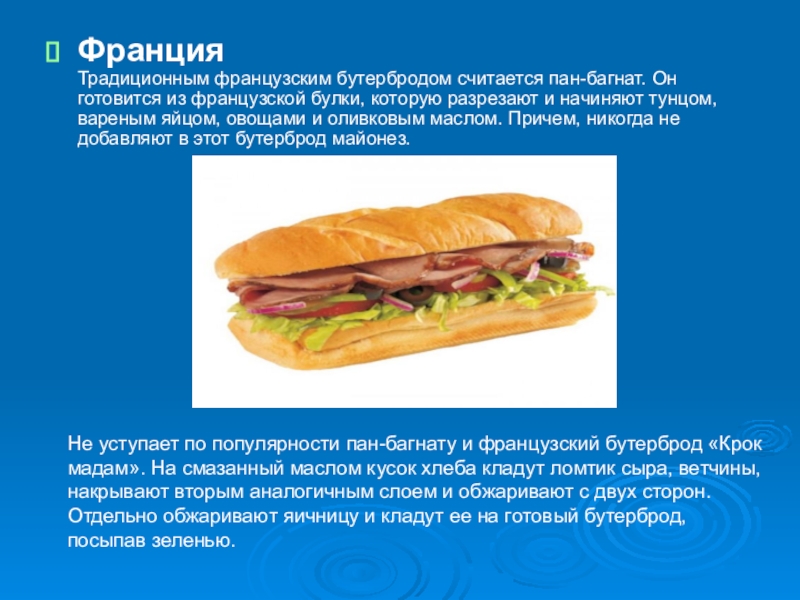 Традиционным французским бутербродом считается пан-багнат. Он готовится из французской булки, которую
