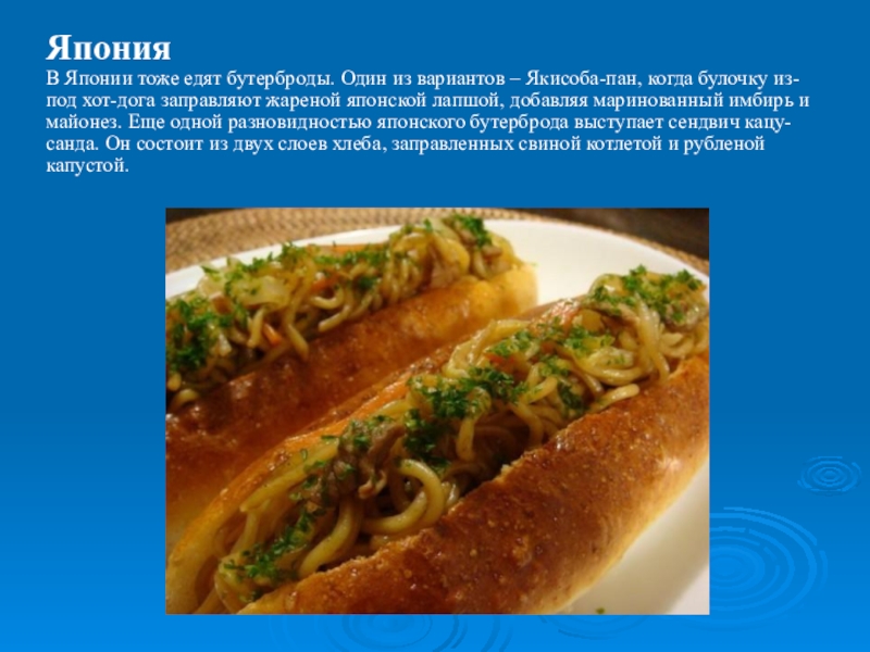 булочку из-под хот-дога заправляют жареной японской лапшой, добавляя маринованный имбирь и майонез. Еще одной разновидностью японского бутерброда выступает сендвич кацу-санда. Он состоит из двух слоев хлеба, заправленных свиной котлетой и рубленой капустой.