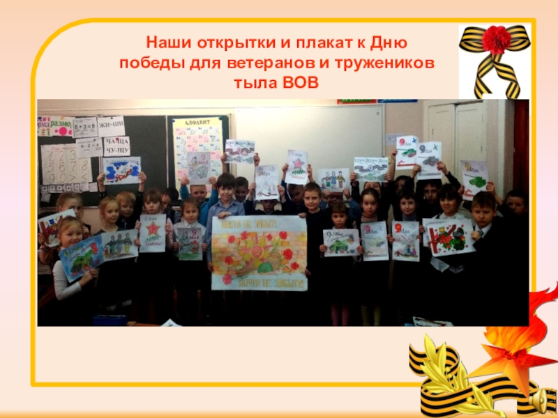 Слайд 25Наши открытки и плакат к Дню победы для ветеранов и тружеников