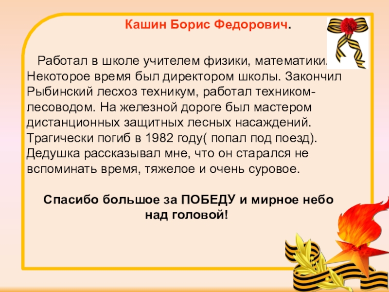 У меня и моих сверстников счастливое детство. Мы не слышим сейчас над головой рокота вражеских самолётов, не прячемся в бомбоубежища, не страдаем от голода и разрухи. Но наш святой долг: хранить в памяти имена и подвиги тех людей, кто выжил или отдал свою молодость и жизнь за наше будущее. Мы - их потомки.