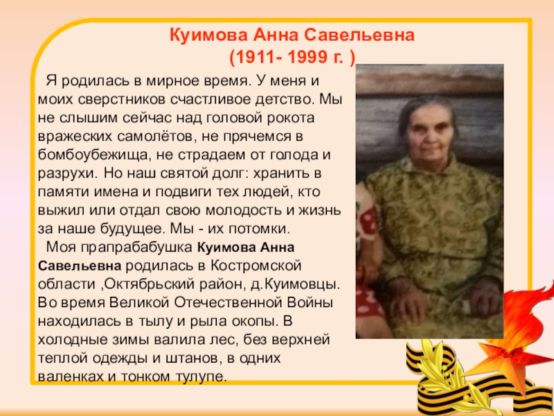 Моя прапрабабушка Куимова Анна Савельевна родилась в Костромской области ,Октябрьский район, д.Куимовцы. Во время Великой Отечественной Войны находилась в тылу и рыла окопы. В холодные зимы валила лес, без верхней теплой одежды и штанов, в одних валенках и тонком тулупе.