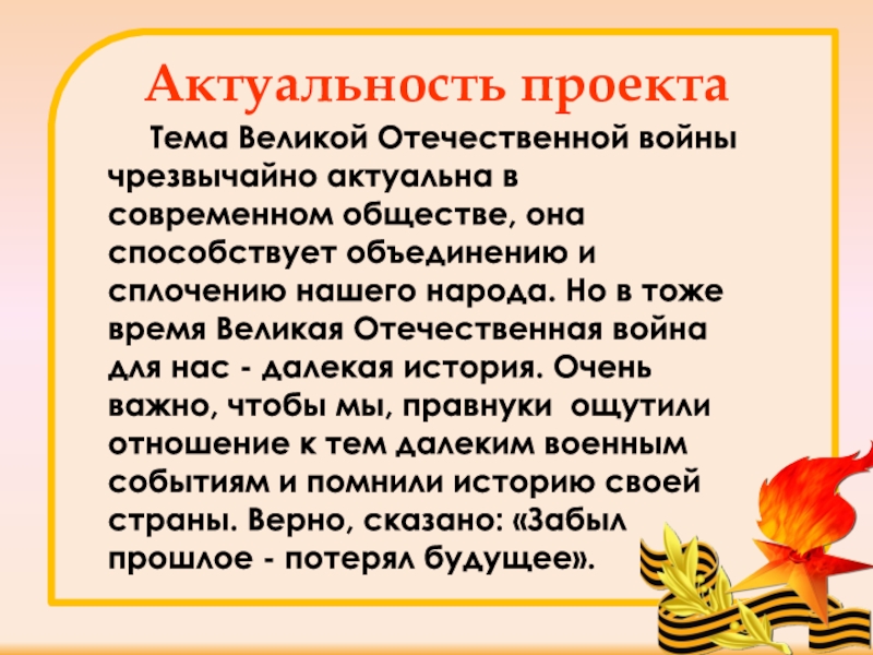 Слайд 3Тема Великой Отечественной войны чрезвычайно актуальна в современном обществе, она способствует