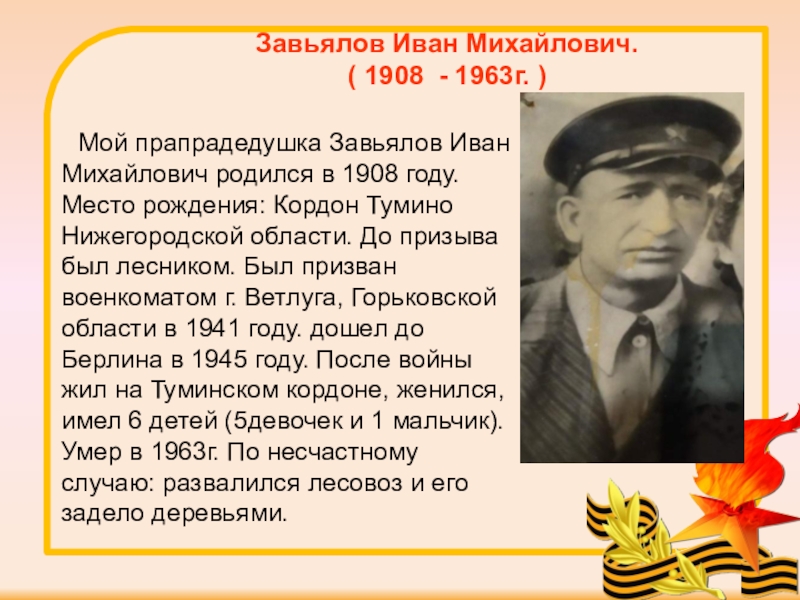 Завьялов Иван Михайлович родился в 1908 году. Место рождения: Кордон Тумино Нижегородской области. До призыва был лесником. Был призван военкоматом г. Ветлуга, Горьковской области в 1941 году. дошел до Берлина в 1945 году. После войны жил на Туминском кордоне, женился, имел 6 детей (5девочек и 1 мальчик). Умер в 1963г. По несчастному случаю: развалился лесовоз и его задело деревьями.