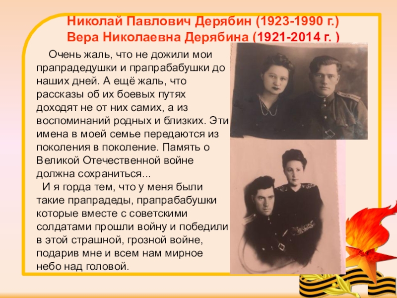 И я горда тем, что у меня были такие прапрадеды, прапрабабушки которые вместе с советскими солдатами прошли войну и победили в этой страшной, грозной войне, подарив мне и всем нам мирное небо над головой.