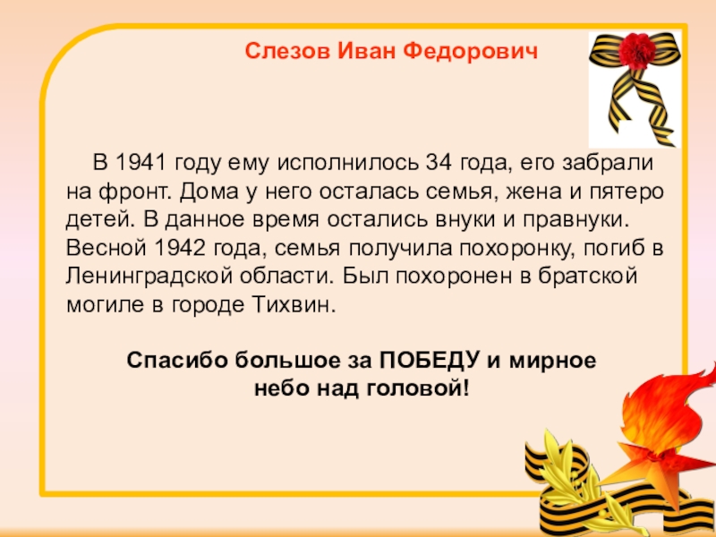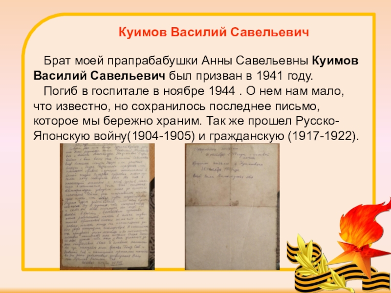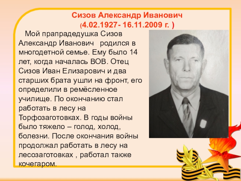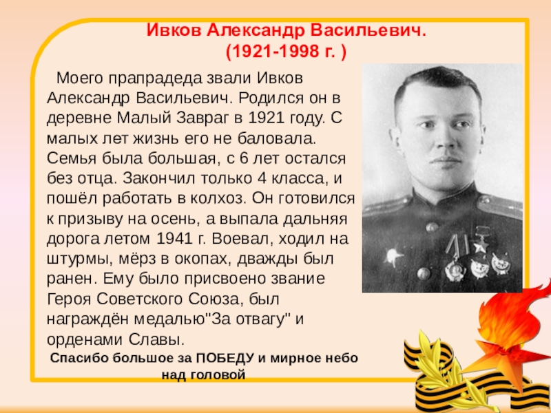 Слайд 21 Моего прапрадеда звали Ивков Александр Васильевич. Родился он в деревне