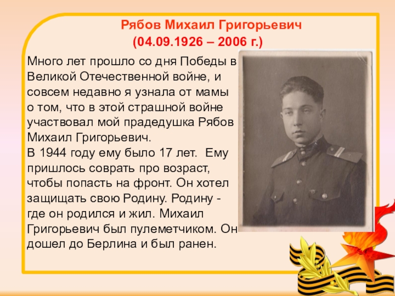 войне, и совсем недавно я узнала от мамы о том, что в этой страшной войне участвовал мой прадедушка Рябов Михаил Григорьевич.
