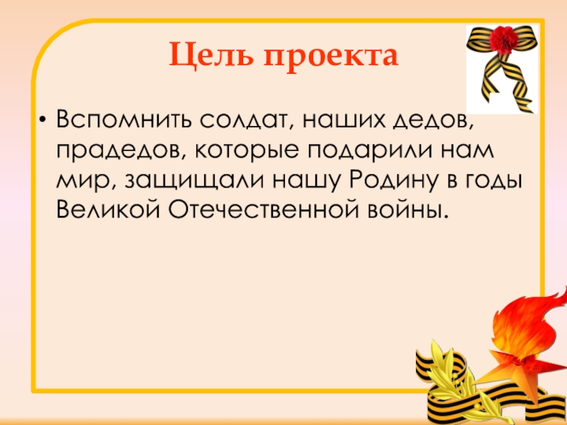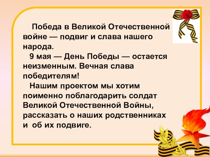 Нашим проектом мы хотим поименно поблагодарить солдат Великой Отечественной Войны, рассказать о наших родственниках и об их подвиге.