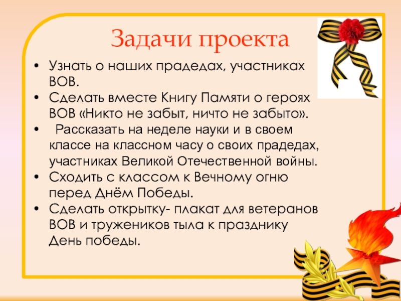 Рассказать на неделе науки и в своем классе на классном часу о своих прадедах, участниках Великой Отечественной войны.