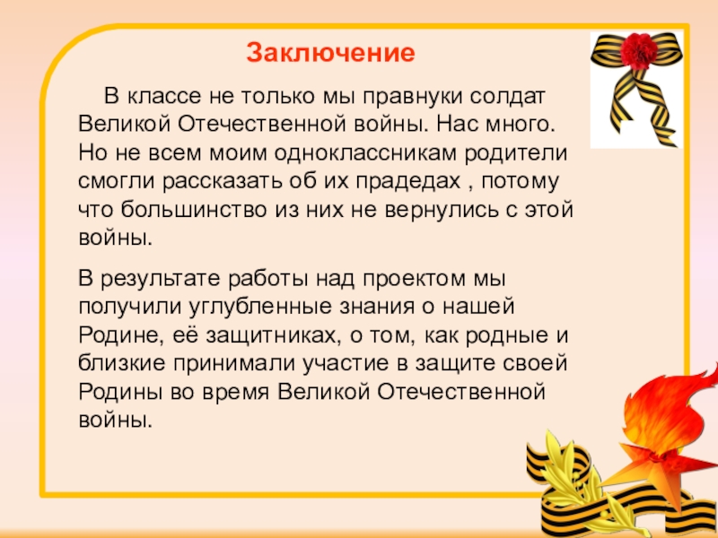 В результате работы над проектом мы получили углубленные знания о нашей Родине, её защитниках, о том, как родные и близкие принимали участие в защите своей Родины во время Великой Отечественной войны.