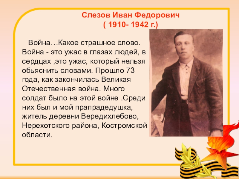 - это ужас в глазах людей, в сердцах ,это ужас, который нельзя обьяснить словами. Прошло 73 года, как закончилась Великая Отечественная война. Много солдат было на этой войне .Среди них был и мой прапрадедушка, житель деревни Вередихлебово, Нерехотского района, Костромской области.