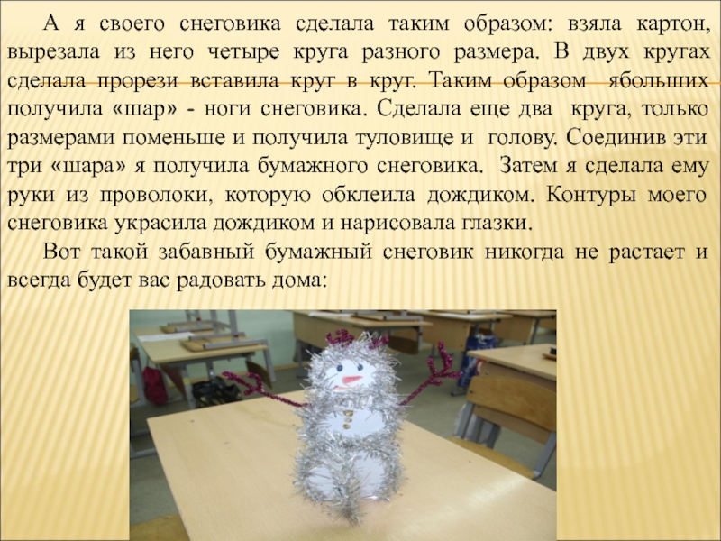 него четыре круга разного размера. В двух кругах сделала прорези вставила круг в круг. Таким образом ябольших получила «шар» - ноги снеговика. Сделала еще два круга, только размерами поменьше и получила туловище и голову. Соединив эти три «шара» я получила бумажного снеговика. Затем я сделала ему руки из проволоки, которую обклеила дождиком. Контуры моего снеговика украсила дождиком и нарисовала глазки.