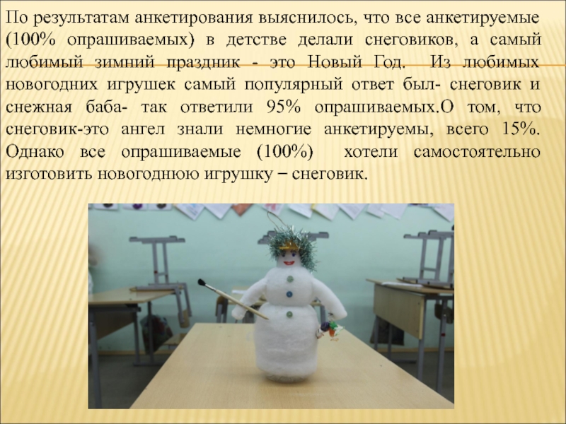 делали снеговиков, а самый любимый зимний праздник - это Новый Год. Из любимых новогодних игрушек самый популярный ответ был- снеговик и снежная баба- так ответили 95% опрашиваемых.О том, что снеговик-это ангел знали немногие анкетируемы, всего 15%. Однако все опрашиваемые (100%) хотели самостоятельно изготовить новогоднюю игрушку – снеговик.