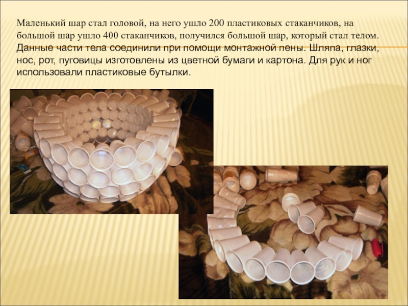 большой шар ушло 400 стаканчиков, получился большой шар, который стал телом. Данные части тела соединили при помощи монтажной пены. Шляпа, глазки, нос, рот, пуговицы изготовлены из цветной бумаги и картона. Для рук и ног использовали пластиковые бутылки.
