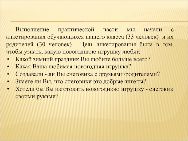 человек) и их родителей (30 человек) . Цель анкетирования была в том, чтобы узнать, какую новогоднюю игрушку любят: