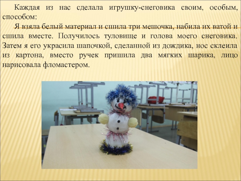 Вот почему мы решили изготовить новогоднюю игрушку - снеговик своими руками и научить этому ребят нашего класса.