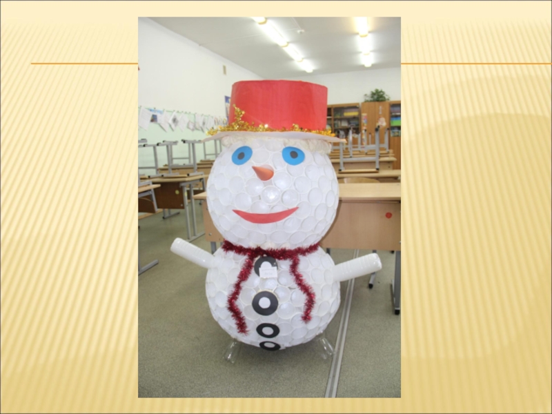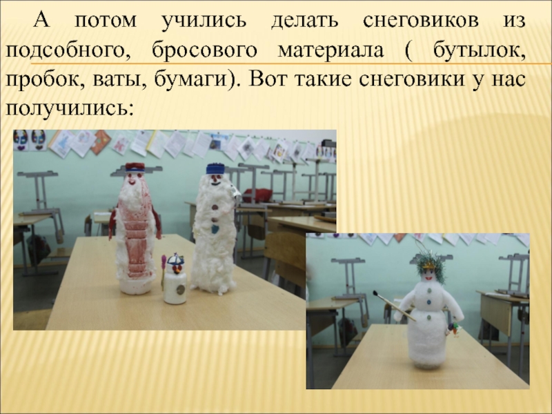 Слайд 14А потом учились делать снеговиков из подсобного, бросового материала ( бутылок,