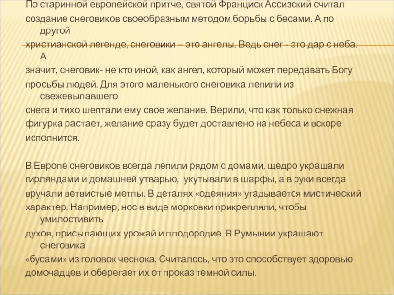 духов, присылающих урожай и плодородие. В Румынии украшают снеговика