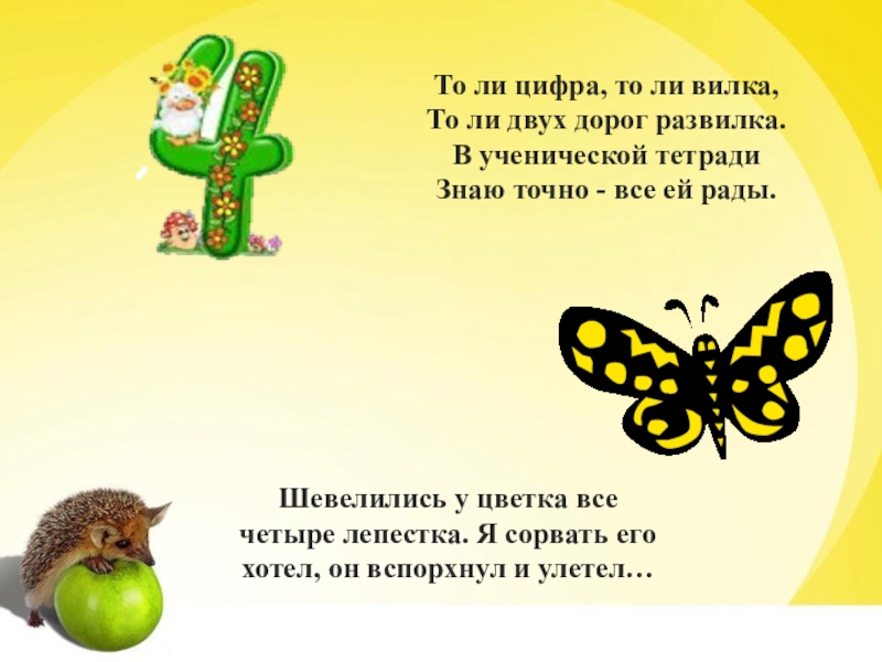 Шевелились у цветка все четыре лепестка. Я сорвать его хотел, он вспорхнул и улетел…