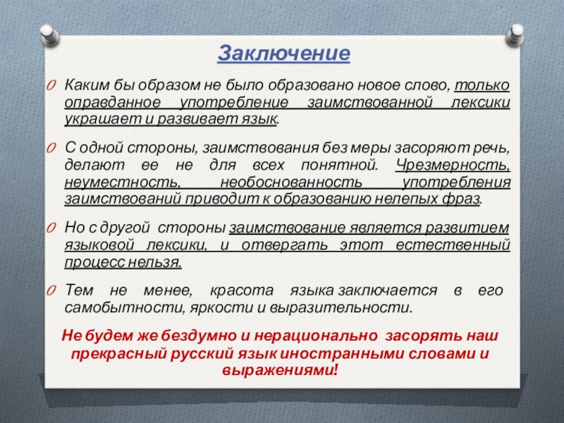 Но с другой стороны заимствование является развитием языковой лексики, и отвергать этот естественный процесс нельзя.