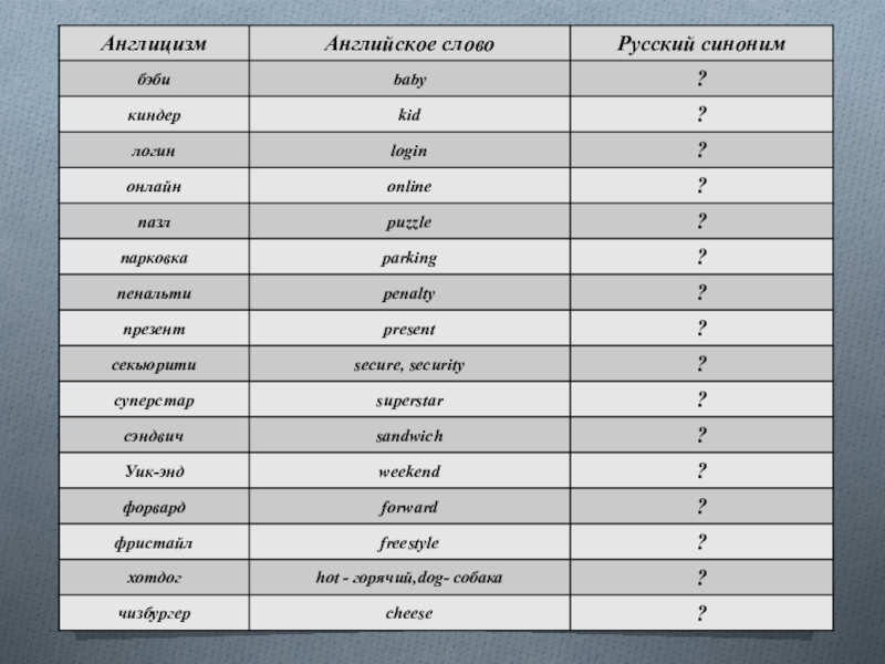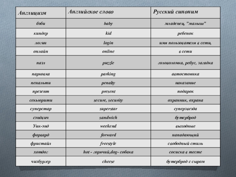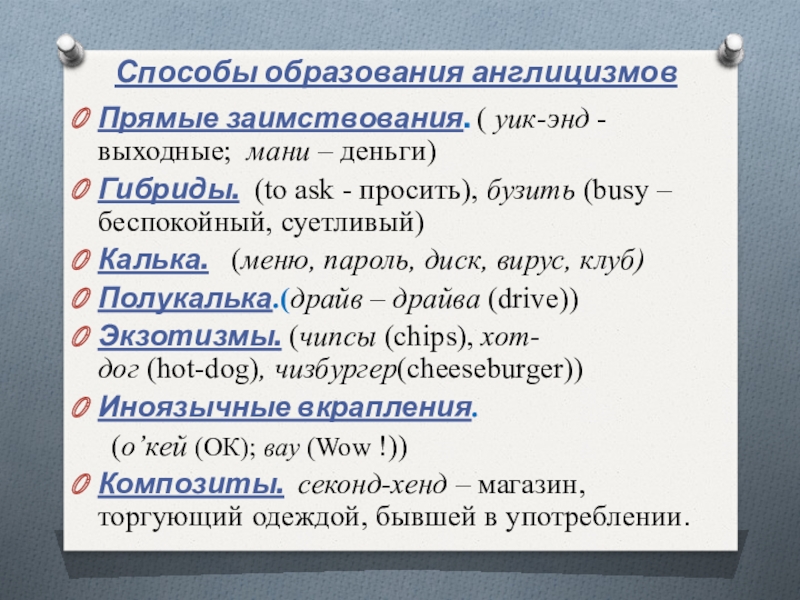Прямые заимствования. ( уик-энд - выходные; мани – деньги)