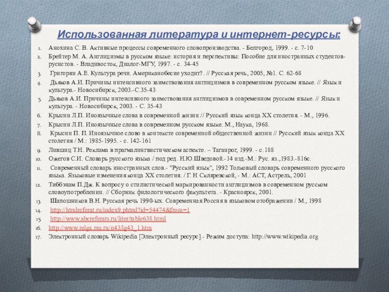 Дьяков А.И. Причины интенсивного заимствования англицизмов в современном русском языке. // Язык и культура.- Новосибирск, 2003.-С.35-43