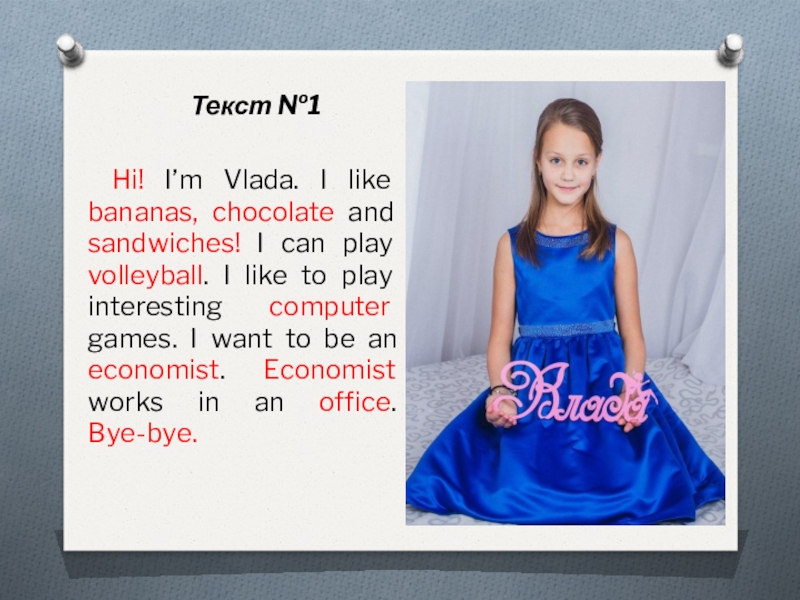 can play volleyball. I like to play interesting computer games. I want to be an economist. Economist works in an office. Bye-bye.