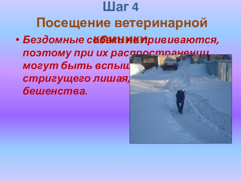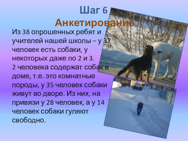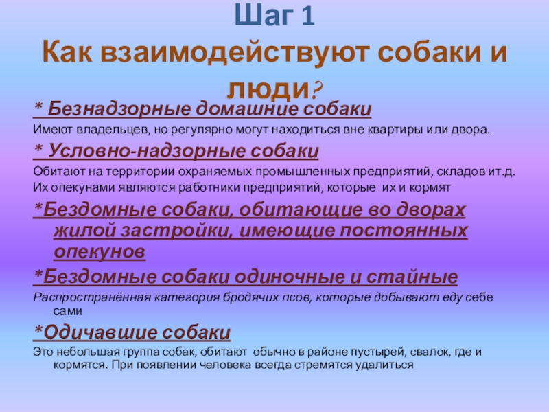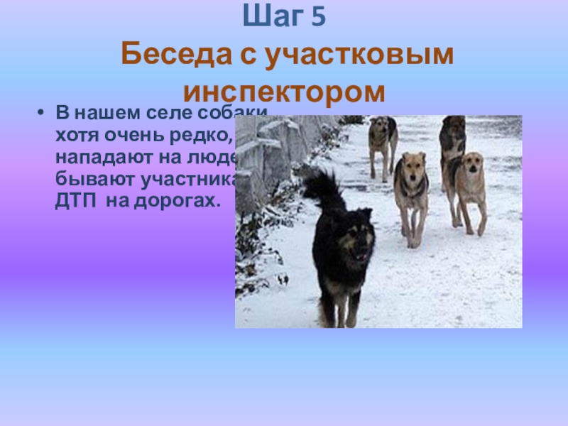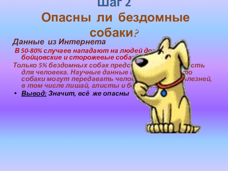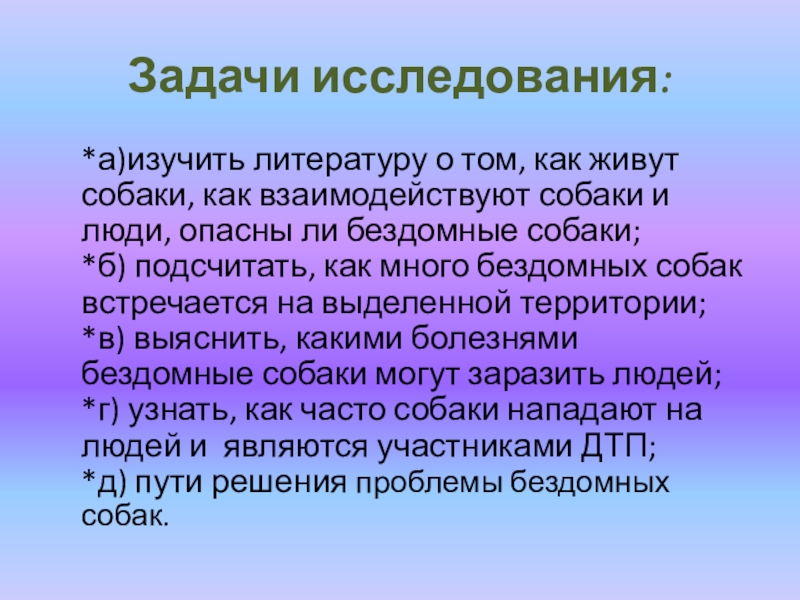 взаимодействуют собаки и люди, опасны ли бездомные собаки; *б) подсчитать, как много бездомных собак встречается на выделенной территории; *в) выяснить, какими болезнями бездомные собаки могут заразить людей; *г) узнать, как часто собаки нападают на людей и являются участниками ДТП; *д) пути решения проблемы бездомных собак.