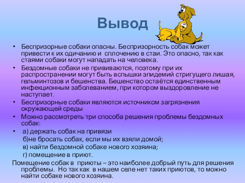 Помещение собак в приюты – это наиболее добрый путь для решения проблемы. Но так как в нашем селе нет таких приютов, то можно найти собаке нового хозяина.