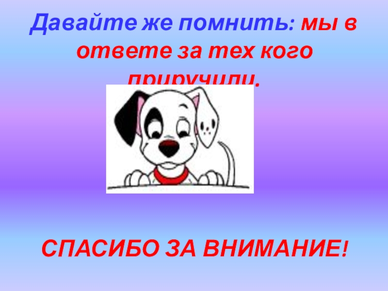 Слайд 13Давайте же помнить: мы в ответе за тех кого приручили.