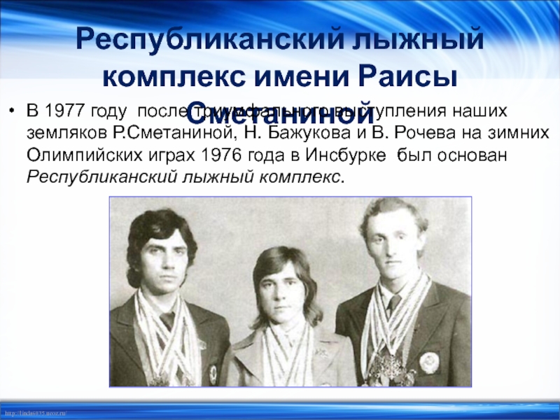 наших земляков Р.Сметаниной, Н. Бажукова и В. Рочева на зимних Олимпийских играх 1976 года в Инсбурке был основан Республиканский лыжный комплекс.