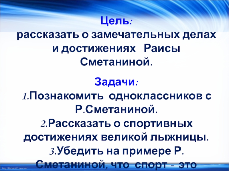 3.Убедить на примере Р.Сметаниной, что спорт - это здорово.