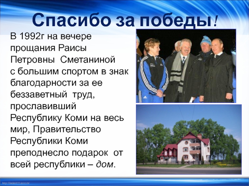 беззаветный труд, прославивший Республику Коми на весь мир, Правительство Республики Коми преподнесло подарок от всей республики – дом.