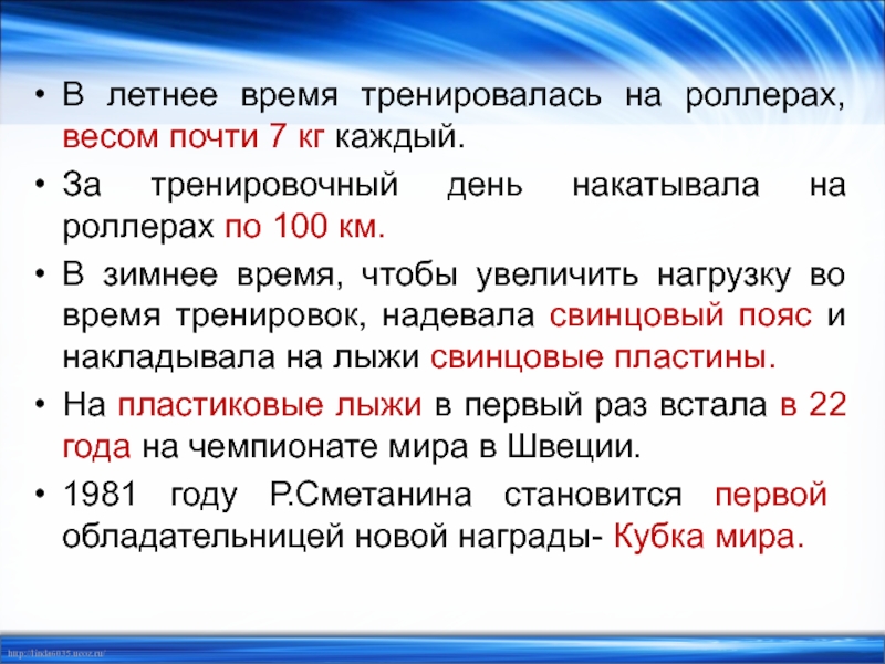 Слайд 5В летнее время тренировалась на роллерах, весом почти 7 кг каждый.