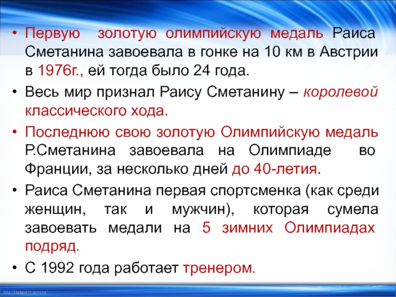 Слайд 6Первую золотую олимпийскую медаль Раиса Сметанина завоевала в гонке на 10