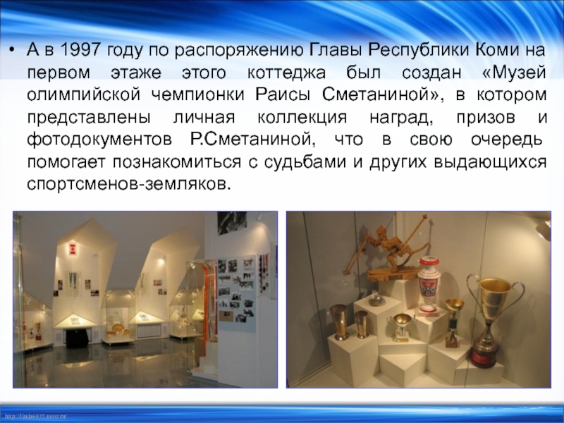 этаже этого коттеджа был создан «Музей олимпийской чемпионки Раисы Сметаниной», в котором представлены личная коллекция наград, призов и фотодокументов Р.Сметаниной, что в свою очередь помогает познакомиться с судьбами и других выдающихся спортсменов-земляков.
