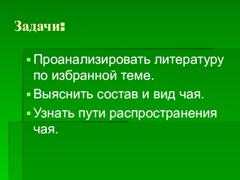 Задачи:Проанализировать литературу по избранной теме.Выяснить состав и вид чая.Узнать пути распространения чая.