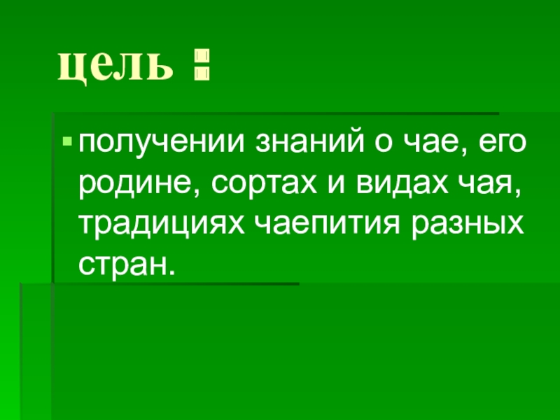 цель :получении знаний о чае, его родине, сортах и видах чая, традициях чаепития разных стран.
