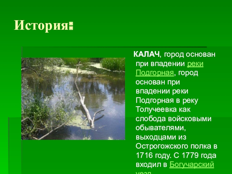 История:  КАЛАЧ, город основан при впадении реки Подгорная, город основан при впадении реки Подгорная в реку Толучеевка как слобода