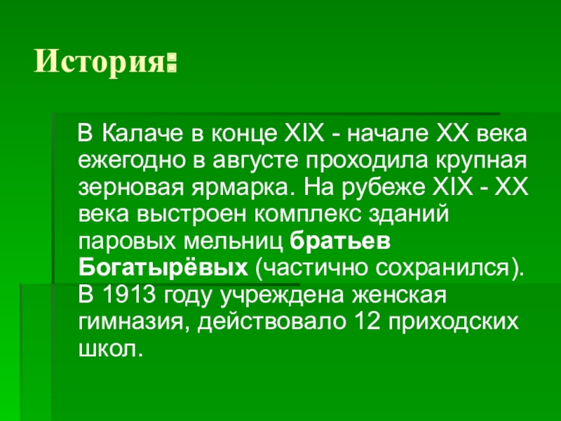 История:  В Калаче в конце XIX - начале XX века ежегодно в августе проходила крупная зерновая
