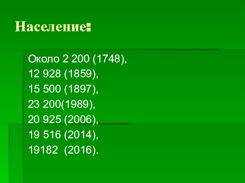 Население: Около 2 200 (1748), 12 928 (1859), 15 500 (1897), 23 200(1989), 20 925 (2006), 19