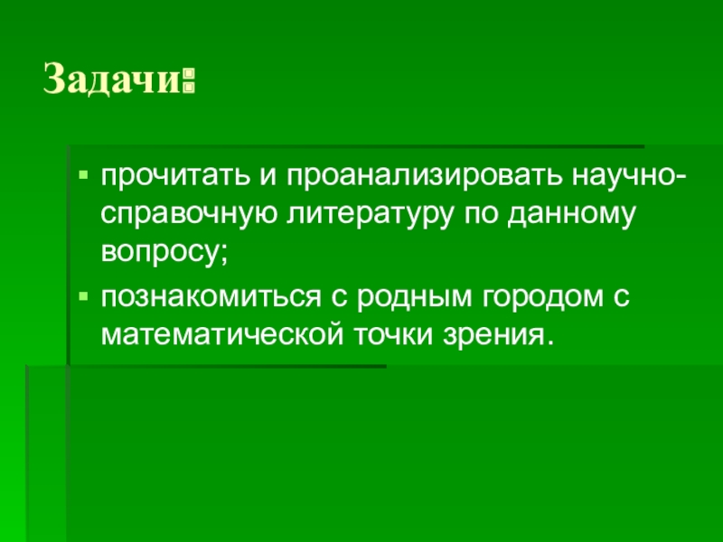 Задачи:прочитать и проанализировать научно-справочную литературу по данному вопросу;познакомиться с родным городом с математической точки зрения.