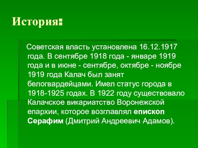 - январе 1919 года и в июне - сентябре, октябре - ноябре 1919 года Калач был занят белогвардейцами. Имел статус города в 1918-1925 годах. В 1922 году существовало Калачское викариатство Воронежской епархии, которое возглавлял епископ Серафим (Дмитрий Андреевич Адамов).